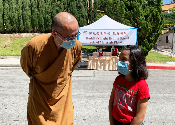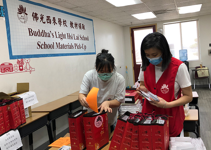 Following the government mandate in response to the ongoing pandemic, the Buddha’s Light Hsi Lai School has started to offer the Saturday Chinese classes and after school programs online. August 30th marks the beginning of the remote learning program with a drive-through at the main entrance. Nearly 150 parents participated in the exchange of learning materials and forms in an orderly manner.