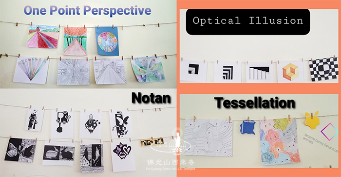 There were four sessions with different topics: Perspective Drawing, Notan Art, Optical Illusion Art, and Tessellation Art. Each method has its unique meaning. We were hoping that through the journey of drawing, the students can learn to think from many perspectives in their lives and calm their minds in stressful times.