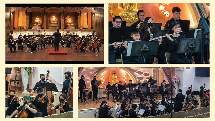 Under the direction of conductor Isaiah Castro, BLYSO from Fo Guang Shan Hsi Lai Temple presented a magnificent New Year concert welcoming 2022 with great optimism. Four classical pieces and two Buddhist pieces conveyed messages of peace and hope, including the Song of Fo Guang Shan, the Song of Dharma Propagator, Symphony No. 7 in A major, Op. 92, composed by Ludwig van Beethoven, and Finlandia, Op. 26, composed by the Finnish composer Jean Sibelius. BLYSO was formed in 1993 to help spread Dharma joy by combining the beauty of Buddhist music with classical Western music. The Prayer for World Peace Ceremony and the New Year Concert brought people of various faiths together to stride towards peace — coming together is a start, staying as one is progress, and working in unison is true success! May we continue to settle our minds and enhance world peace for a happy, harmonious, healthy 2022 and beyond.