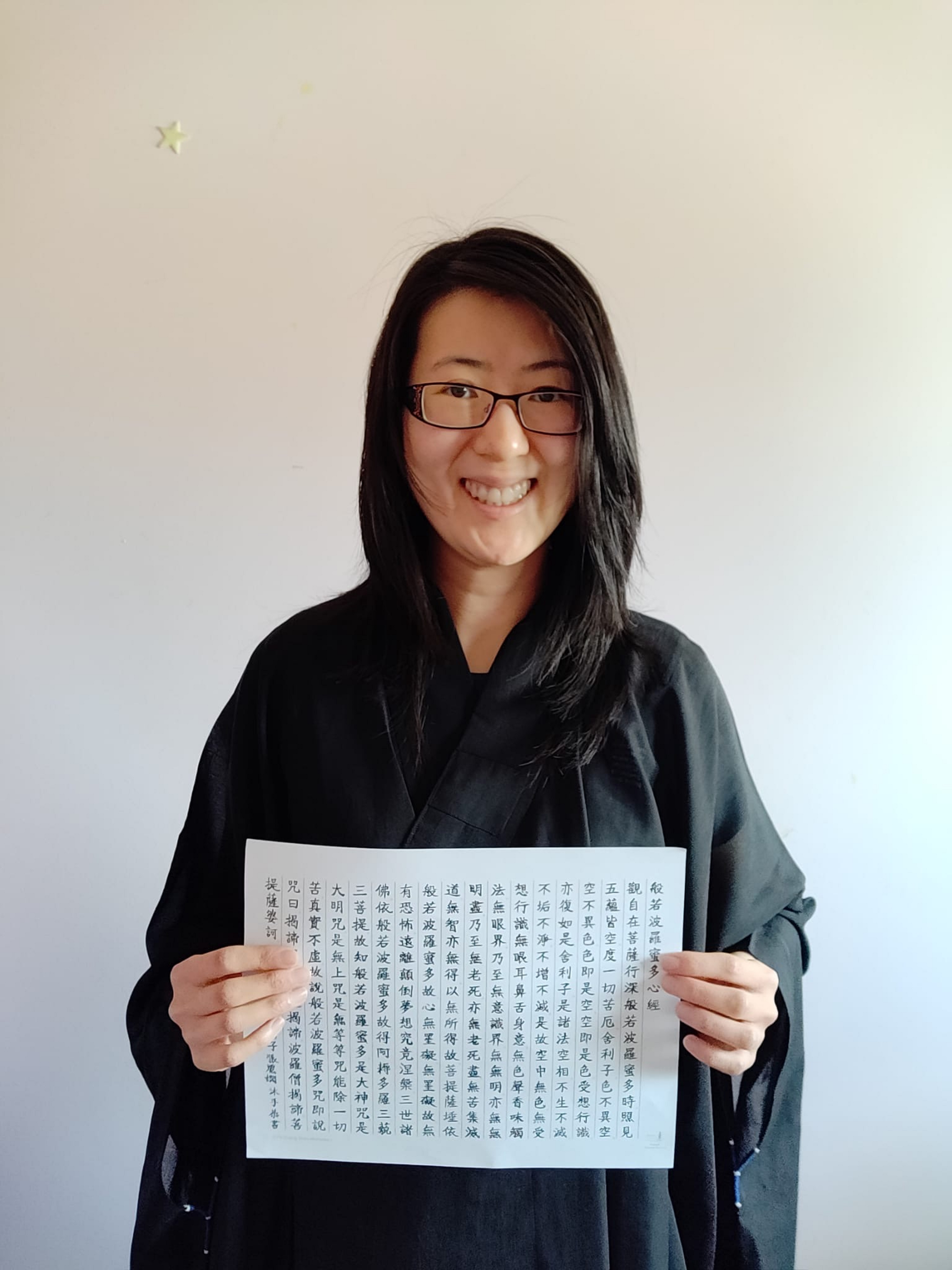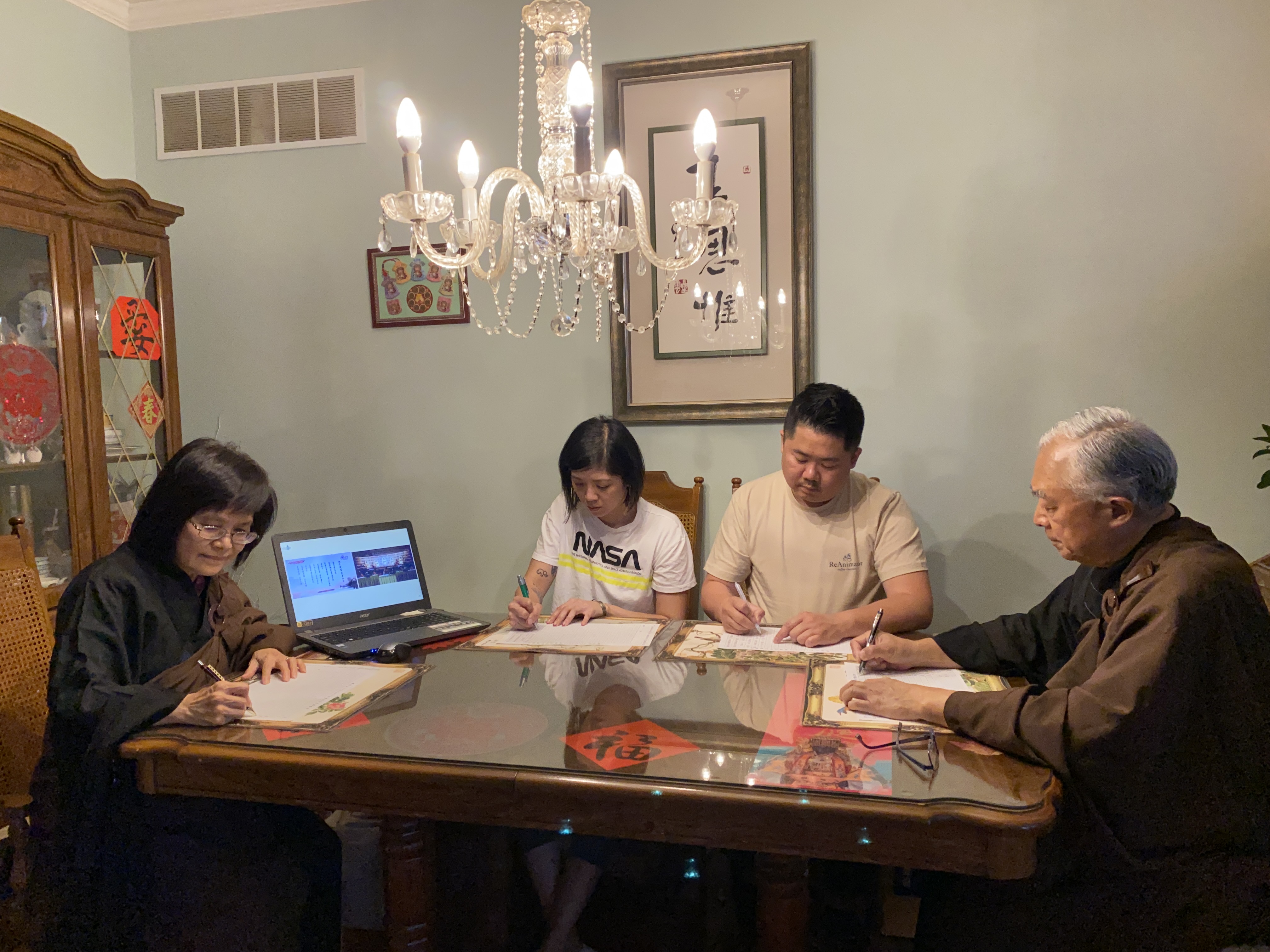 Yingjia Hu, a member of BLIA Orlando Eastern Subchapter, shared, “Because of the online synchronization, I can see all the venerables in FGS Temples transcribing the Heart Sutra with us. With the soothing melodious guqin music, I can concentrate and write slowly, one stroke at a time, to understand the true meaning of the Heart Sutra between the lines.” Yugui Lin of the Western Subchapter said, “I tried to transcribe the Heart Sutra in different fonts—-running script, regular script, and official script. I formatted those fonts on rice paper ahead of time and humbled my mind when writing. I told myself to be completely humble and repent sincerely. I try to connect with the Buddha one brushstroke at a time, so my mind and Buddha become one.”