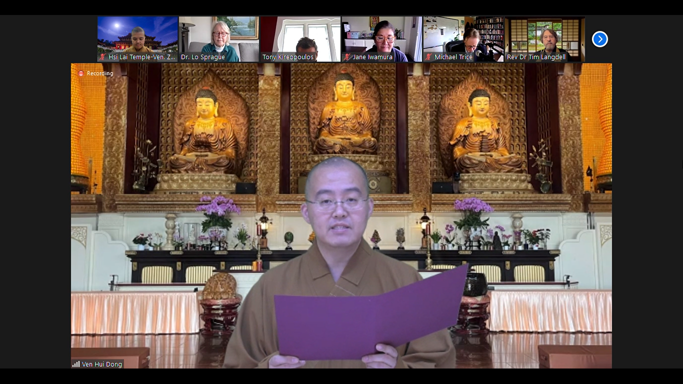 After the successful online dialogue last year, the “National Buddhist-Christian Dialogue” was held again this year on May 19 using Zoom. Christian and Buddhist leaders of different denominations and lineages from all across America, with 20 representatives, gathered to join in this dialogue. Dr. Lois Sprague from the Guibord Center gave the opening speech welcoming everyone, followed by Ven. Hui Dong, Abbot of Hsi Lai Temple, reading the “Prayer for World Peace” written by Ven. Master Hsing Yun.