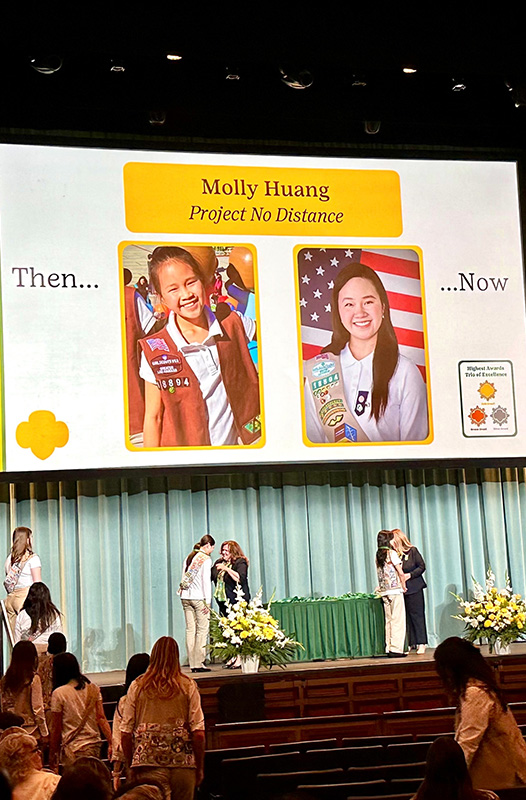 On June 2, 2024, the Girl Scouts of Greater Los Angeles (GSGLA) hosted the Gold Award Ceremony at the Pasadena Civic Auditorium. Molly Huang and Allison Chieh from Buddha’s Light Hsi Lai Girl Scout Troop 18894 received the prestigious Gold Award for their projects "Project No Distance" and "Better Environment, Better Tomorrow," respectively. Venerable Zhi San, the Guiding Venerable of Hsi Lai Girl Scouts, along with 15 family members and friends, attended the event. Nearly a thousand attendees celebrated the achievements of 207 awardees.