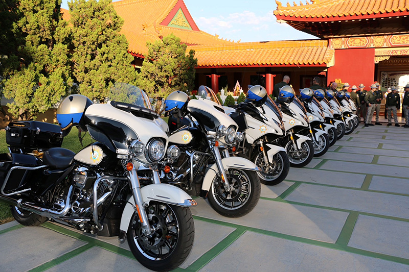 On October 2, 2024, about 130 officers from the California Highway Patrol's (CHP) Santa Fe Springs Area gathered in the courtyard of Hsi Lai Temple for a formal inspection of their uniforms, firearms, and motorcycles. Captain Melissa Hammond and Officer Danny Margaris led the inspection. The officers received a warm welcome from Venerable Hui Dong, Abbot of Hsi Lai Temple, who was joined by Venerables Hui Cheng and Hui Shiuan, as well as Alex Wu, President of Buddha's Light International Association (BLIA) Los Angeles Chapter.