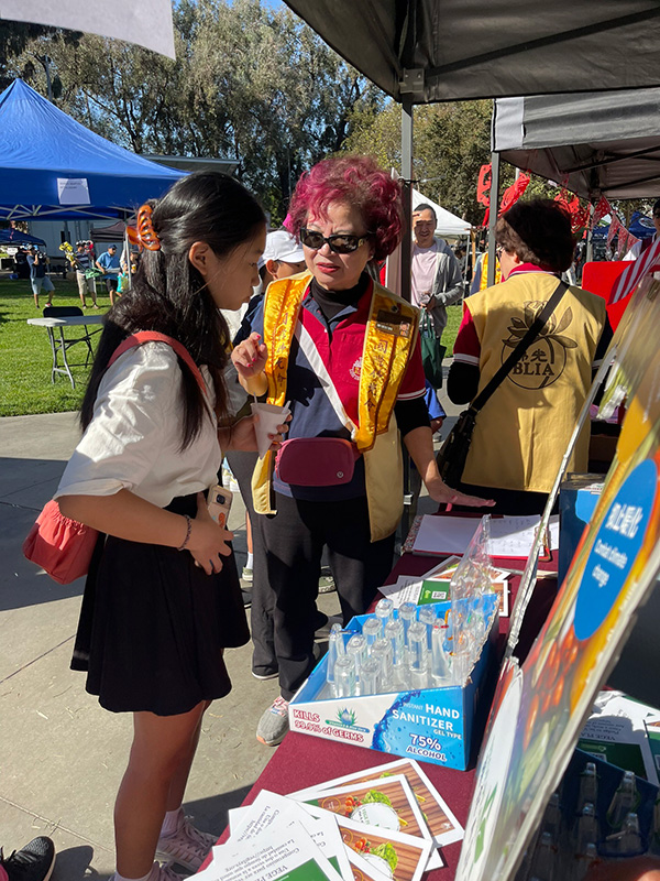 The BLIA members from Hacienda Heights promoted Vege Plan A, advocating the benefits of a plant-based diet and gaining interest from nearly 100 attendees. Meanwhile, BLIA members from Rowland Heights shared the teachings of Humanistic Buddhism, Fo Guang Shan Hsi Lai Temple, and Buddha’s Light Hsi Lai School. They handed out bilingual bookmarks from Venerable Master Hsing Yun's Humble Table, Wise Fare and the bilingual series Buddhism in Every Step, creating connections with visitors. Their ring toss booth, featuring Venerable Master Hsing Yun's blessings, "May You Be Free as Cloud and Water, Auspicious and Joyful," was a crowd favorite, with cheers and laughter filling the air.