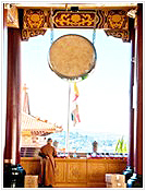 殿中佛桌左側,有一巨大圓型木雕法器,稱為木魚;取魚之形狀,是因為魚目無眼簾,喻意時時保持覺醒,勤習佛法,精進不懈。右方置有缽狀之大磬,為佛門早晚課誦、舉行法會時,領眾唱誦之法器,平時不可隨意敲打。