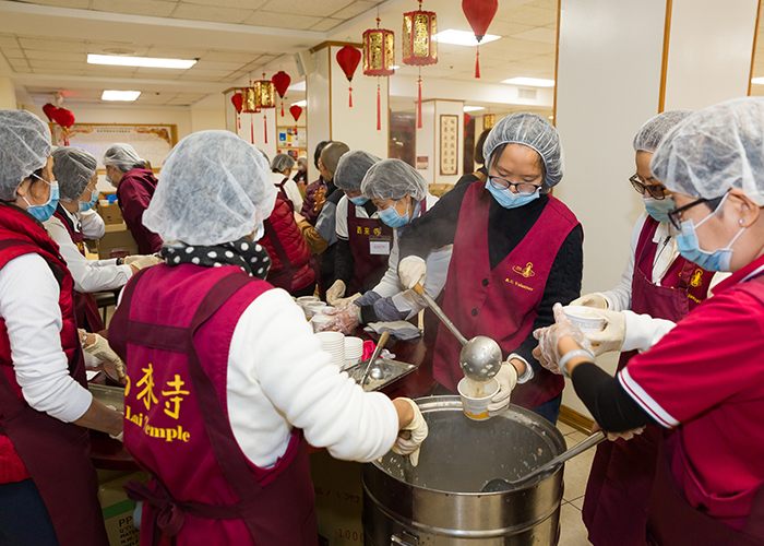 【人間社記者 陳嘯 洛杉磯報導】為慶祝佛陀成道紀念日,佛光山西來寺於 1 月 2 日農曆臘月初八「法寶節」舉行「臘八粥結緣」,與大眾分享佛陀成道歡喜,熱騰騰的臘八粥,讓來山信眾與遊客藉著濃郁美味的臘八粥溫暖人心,共供應了 23000 份。