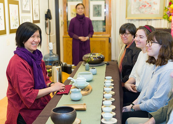 住持慧東法師致歡迎詞之後,妙璽法師帶領大家禪坐放鬆身心,再由西來寺茶禪組的茶師們開始茶禪體驗。從眼觀茶色,鼻聞茶香,到茶湯入口,之後滿口回甘的茶香,去觀察身心的反應,妙璽法師法師用趙州禪師「喫茶去」公案,闡示禪不在深奧難懂的經典和文字,而是在生活中專注每個當下。