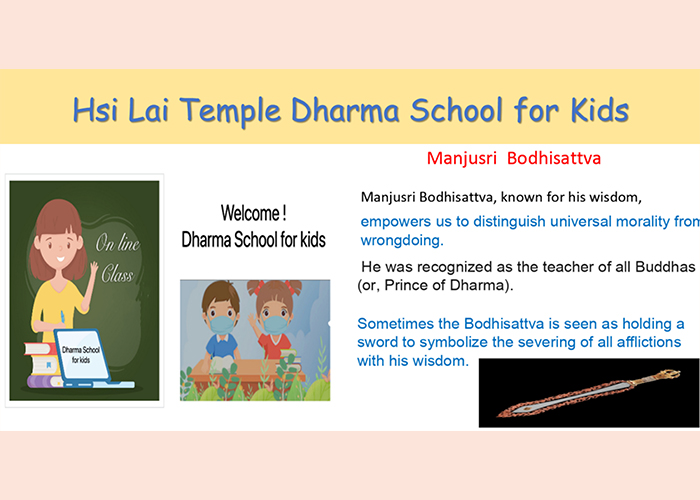 兒童佛學班招收7-10 歲會講英文的兒童,課程主要傳遞三好的理念。課程內容包含以故事的方式探討自己的優缺點、以及尋找合適的方式改正缺點,也訓練孩子們公共演說的能力,因多數亞洲小孩不善於表達。除此之外,還有機會成為小小導覽員。小小導覽員的訓練不但要有公共演說的膽量、技巧以及記憶力,同時培養孩子們關心他人、為人服務的菩薩精神。