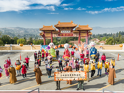 佛光西來學校校長慧東法師於花車遊行前感謝大家的發心,精心策畫、布置,共同成就首次Halloween Car Parade。隨後校長乘坐高爾夫球花車,在三好歌的音樂聲中引領車隊分兩個梯次入場,近100個家庭參與。沿途,小朋友和家長在車上不忘展示創意十足的螞蟻雄兵、星際戰警、忍者龜、阿達一族、蜘蛛俠、女巫、吸血鬼服飾,以及全家通力合作布置的花車。