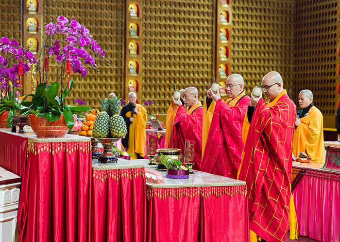 以往獻供都是信眾虔誠禮拜親手獻上每一道菜餚,但因疫情關係以及確保信眾安全,今年由西來寺諸位法師代表信徒奉上茶點、毛巾,虔誠禮拜獻上至誠的供養。