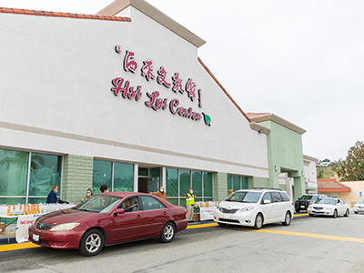 洛杉磯縣警局工業市分局還特別派出警力與洛杉磯協會交通組義工們合作指揮現場交通,讓民眾以得來速(Drive Thru)的方式,有序地領取防疫物資。