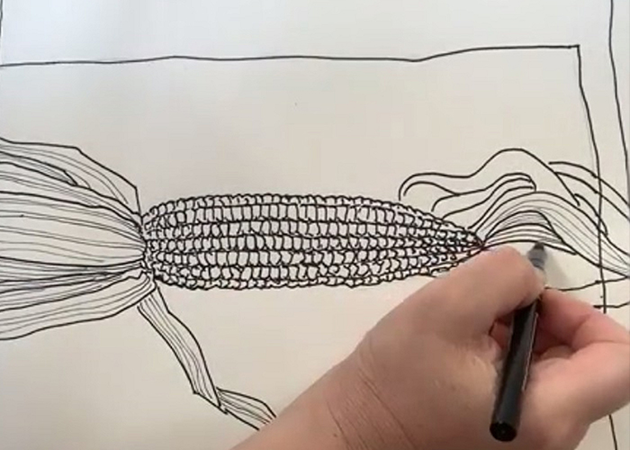 蘿蔔、白菜、玉米怎麼畫?王俊老師先教大家構圖布局,仔細觀察常見的蔬菜外形特別之處,繼而勾勒整體的形狀,再將物體的特色用點、線、空間表現,並應用透視、遠近、顏色深淺來突出作品的表現。有些細處需要一筆一畫耐心的完成,老師説這是培養耐力最好的時候。