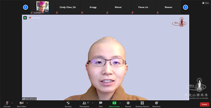 【人間社 心奉 洛杉磯報導】佛光山西來寺秉持落實本土化理念,於4月17日進行2021年第三場英文線上一日精進修持,讓英語系人士在疫情期間也能一起學佛並相互交流。修持課程包括禪修、專題授課、小組討論等,共35人出席參加。