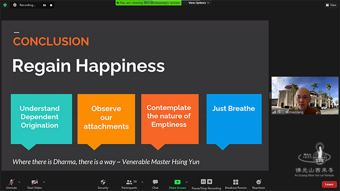西來寺住持慧東法師則在與學員接心時為學員解惑,提問包括「如何在嚴峻的疫情下找到幸福與快樂」、「如何應對生命裡的遺憾」、「如何在禪修時摒除妄念」等。慧東法師從各觀點做詳細的解答,並勉勵學員珍惜人間的因緣,以感恩祝福的心,生活裡必充滿幸福與快樂。