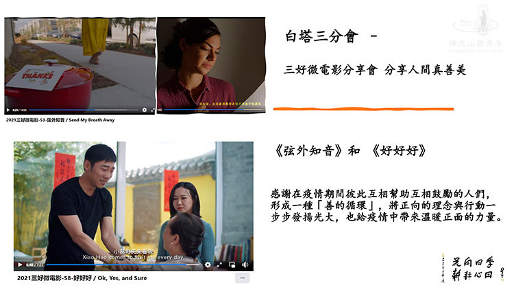 爲了響應國際佛光會主辦的第三届「2021三好微電影國際創作競賽」,傳播人間真善美,白塔三分會在輔導法師法中法師的帶領下,7月28日於線上進行三好微電影讀書分享會。北美洲共有6部參賽作品入圍前100部優秀作品,其中5部來自洛杉磯協會,分會逾 10 人一起觀賞參賽影片和拍攝花絮,探討生命的真善美,進而對生命有所反思和啓發,感恩人生,積極樂觀生活,熱愛生命!