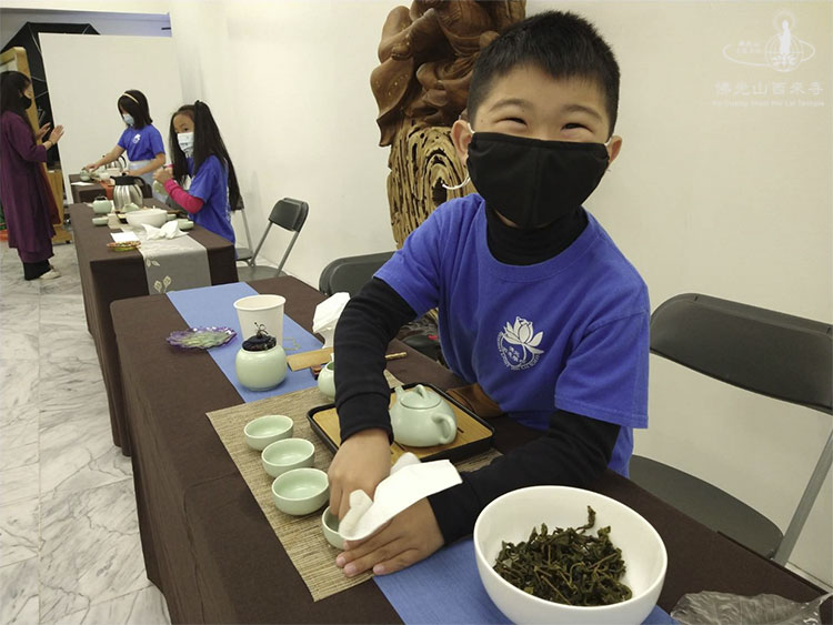 課程負責法師慧軒法師和任課老師鏡靜老師、Jennifer老師,用心設計初階及進階茶禪課程的教學重點,並在課程的最後一天,進行教學成果考核。考試當天,法師和老師們共同布置別具特色的考場,運用六大茶葉、傳統茶餅、精美茶壺和樂器天鼓,讓學生沉浸在清淨素雅之美的環境中,也潛移默化的提升孩子的藝術美感。