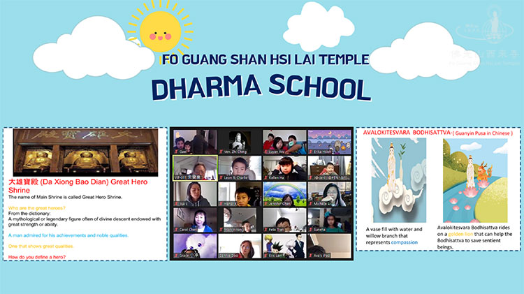 目前佛學班開設了幼兒班,兒童班和青少年班。在為期三個月的課程中,幼兒班的學生通過歌曲、美術和故事等形式,學習了普賢菩薩的三好之行,觀音菩薩的慈悲,地藏菩薩的救拔受苦眾生和文殊師利菩薩的智慧。兒童班學習了四聖諦和初步了解了釋迦牟尼佛,藥師佛和阿彌陀佛,進行了小小導覽員的訓練,並一起討論了十幾個充滿佛法智慧的故事。青年班則進一步深入領會四聖諦的內涵和因果定律,學習了佛陀和高僧大德的故事,並增強了正念靜心的能力。