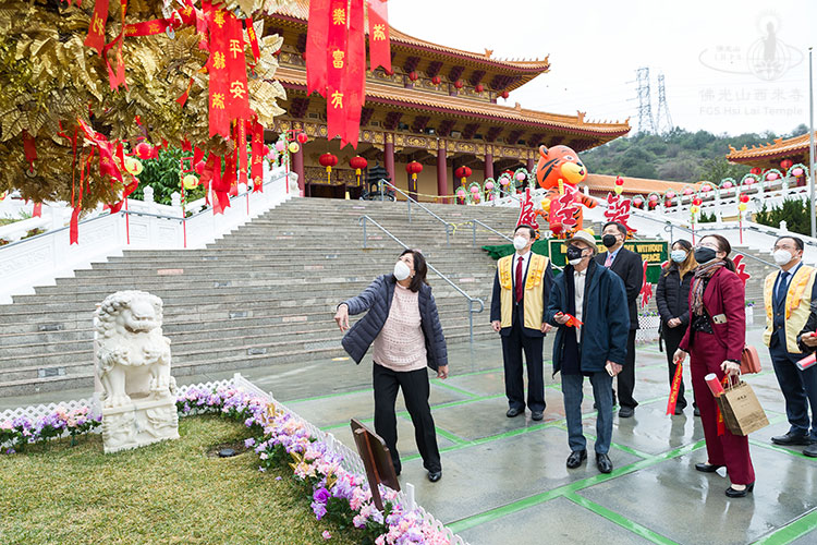 隨後,住持慧東法師為其導覽,介紹大雄寶殿、五聖殿菩薩、供燈的意義、佛光山總本山藍圖、大師新春墨寶及春節遊客參訪的防疫安排等。蘇麗絲委員帶領眾人歡喜投擲祈願彩帶,祝願疫情早日結束、並祝福來臨的虎年一切都繁盛。蘇麗絲委員在會後贈與獎狀,肯定西來寺對社區的貢獻。