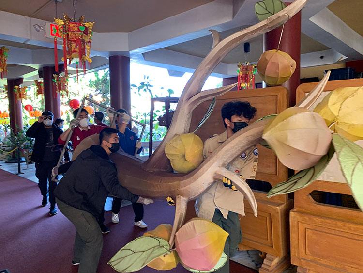 2月26日早上10點,同時也是西來寺本土義工的服務日Day of Giving (四給日),社教組組長知行法師帶領社教組法師及義工們一起出坡。西來分會本土人士、洛杉磯青年一團、青年二團、西來大學青年義工及童軍團等50餘人,齊聚在西來寺成佛大道準備出坡分配。 知行法師為義工們說明,燈會佈置是緣起性空的體現,春節張燈結綵的佈置帶給來山賞燈的人歡喜;春節結束代表因緣告一段落,雖然不捨莊嚴的佈置,但也是時候回歸寺院清淨莊嚴的本來面目。