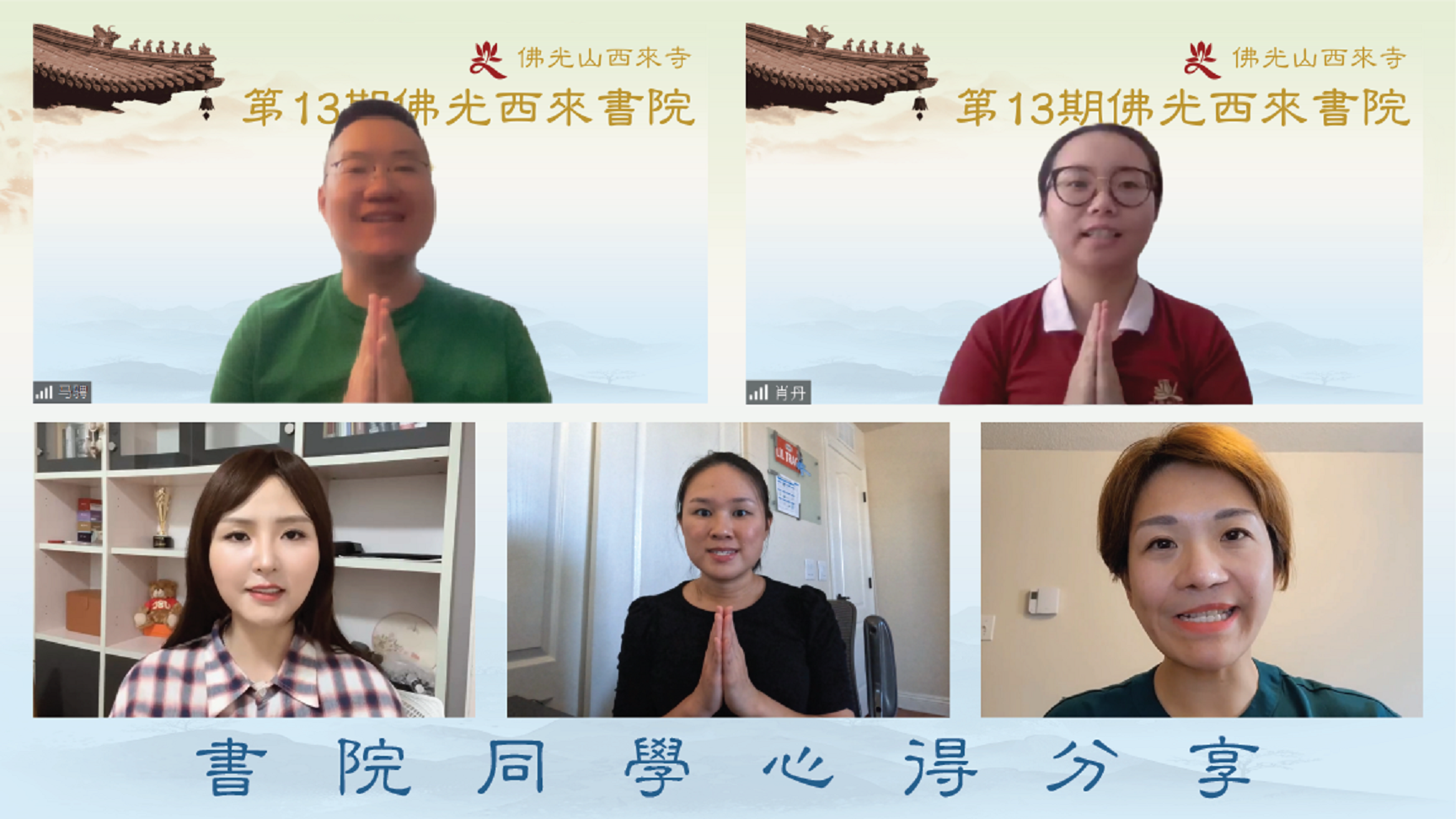 第一次參加線上書院課程的馬騁同學,分享了此次參加書院課程和受三皈五戒的體驗;肖丹同學通過參加雲水禪心生命體驗營而報名了佛光西來書院,學習實踐人間佛教提倡的說好話、存好心、做好事。