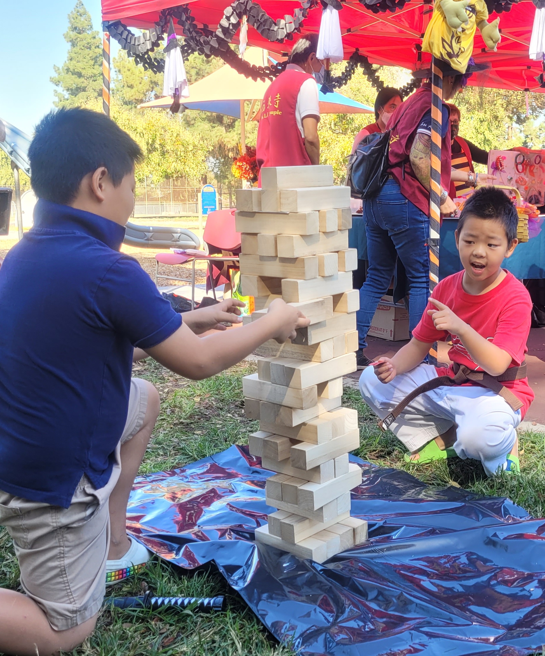 西來攤位提供了大人與小孩都可同歡的遊戲,乒乓球投杯、鐵圈套瓶、連線遊戲、大型積木抽疊樂都吸引了人潮排隊。在Musical chair遊戲中,參與者在音樂響起時圍著椅子繞行,音樂停止則搶坐椅子,沒搶到椅子者被淘汰,遊戲緊張刺激,現場歡聲笑語不斷。