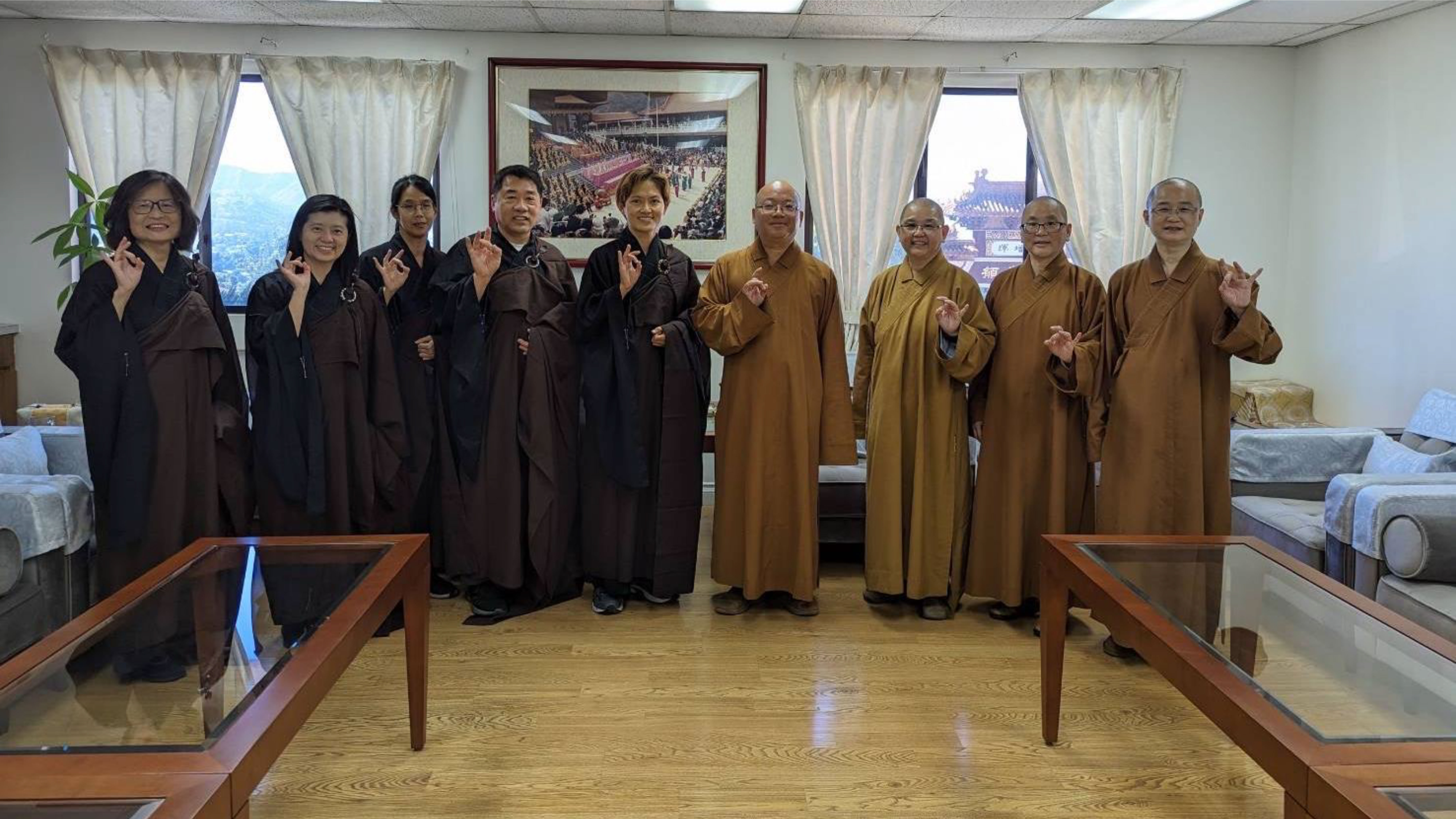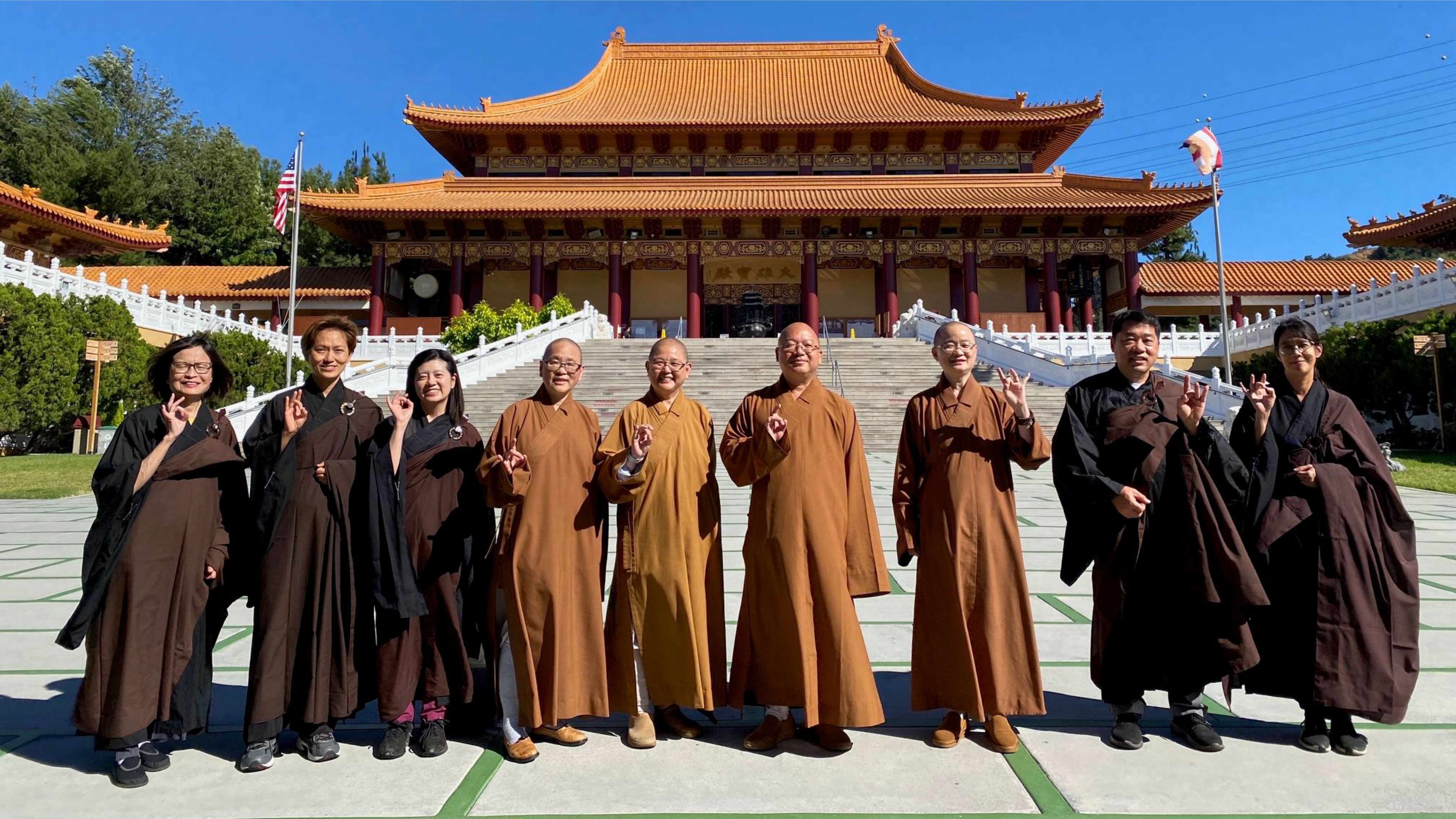 【人間社 雪梨 洛杉磯報導】畢業近20年的「西來佛教學院」第一屆5位學生,7月20日在西來寺和當年授課的師長佛光山住持心保和尚、多倫多佛光山住持覺凡法師重聚,回憶昔日受教於佛光山開山祖師星雲大師及師長們的法喜情境,並於成佛大道合影。