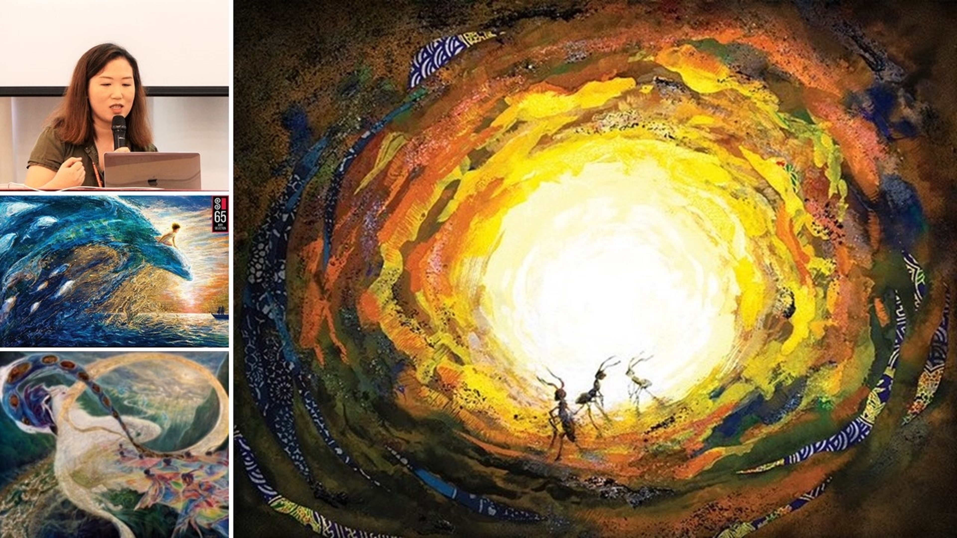 【人間社 王雪鳳 洛杉磯報導】佛光山西來寺佛光緣美術館西來館,8月6日舉行「畫中的畫中的畫:探索自我與無限境界」吳達立創作與展覽主題分享會。藝術家吳達立贈送其展品《海豚之歌》予西來館,由館長慧東法師接受;慧東法師回贈感謝狀,以表參展謝意。分享會近30人於西來寺會堂聆聽。