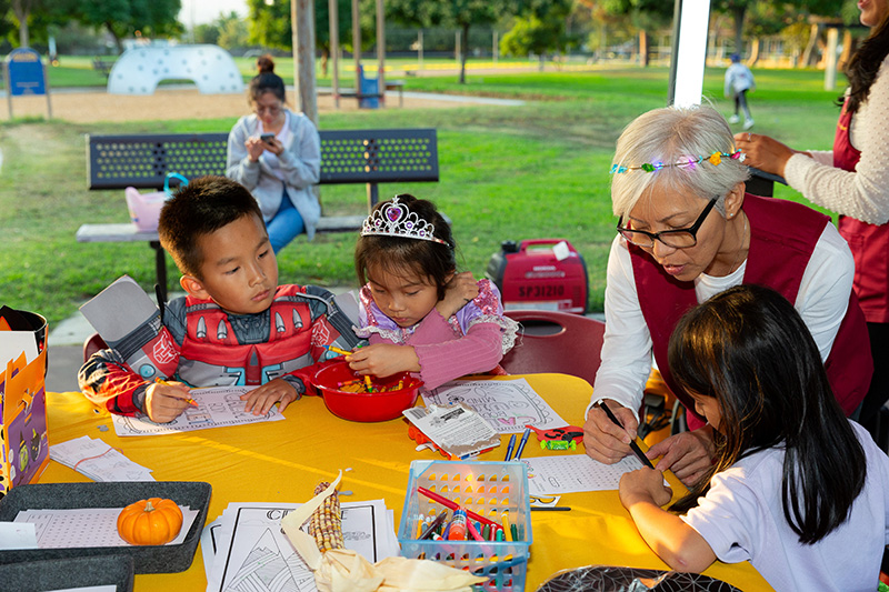 【人間社 潘青霞 洛杉磯報導】洛杉磯縣公園康樂部門(County of Los Angeles Department of Park and Recreation)於10月27日晚間舉辦社區親子活動,佛光山西來寺社教本土組慧澄法師受邀帶領14位義工,其中包括三好學園親子檔參加,在哈崗市威廉斯坦梅茨公園(William Steinmetz Park)以六項親子三好活動及「西來正念糖」,與近800位民眾結緣。