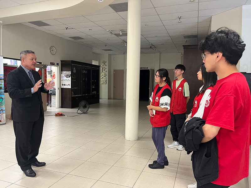 陳敏永主任向實習老師們介紹了中心的各項服務及設備,包括展示書法和繪畫作品的文化走廊、圖書館、會議室及教室等設施,並提到中心曾舉辦曬書節活動,鼓勵民眾交換書籍,呼應星雲大師的地球環保永續經營理念。陳主任也鼓勵實習老師申請僑委會「臺灣青年海外搭僑計畫」,前往世界各地見習,拓寬視野。