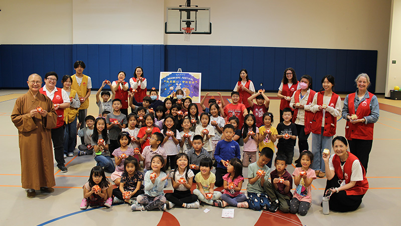 課輔班的學生們集體創作,共同製作中秋卡片,親手寫上中英文祝福,前往西來寺向常住法師獻上祝福的同時,也感謝法師們平日的照顧。另外,學生們也在法師的帶領下,一同前往大雄寶殿,為家人及大眾祈福。回家前,學生們也一起向法師及老師們祝賀,並與家長一同在活動海報前合影紀念。