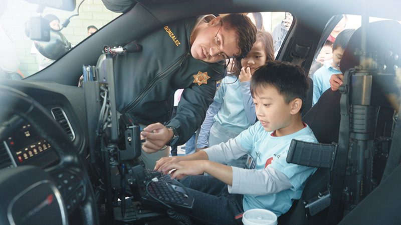 隨後,學生們參觀警車,親身體驗坐在警車裡的感覺,對騎乘重達900磅的警用摩托車也躍躍欲試。他們圍著警官,詢問警車內的設備,如攝影機及玻璃是否具備防彈功能,並探究警官隨身裝備警棍和電擊器的用途,以及警官執勤時的各種經驗。學生們還與跳著舞的吉祥物花栗鼠「Chipper」警官擊掌,摸摸牠的大門牙,一領到寫有「小小警官」(Junior Officer) 的徽章貼紙,就立即貼在胸口,互相展示。